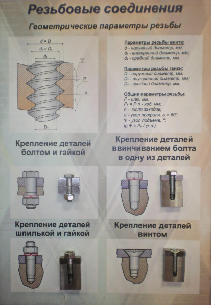Планшет формата А2 с возможностью использования в настенном и настольном вариантах. На планшете даны основные геометрические параметры резьбы, схема и образцы типовых резьбовых соединений изготовленных из металла (сталь-алюминий):