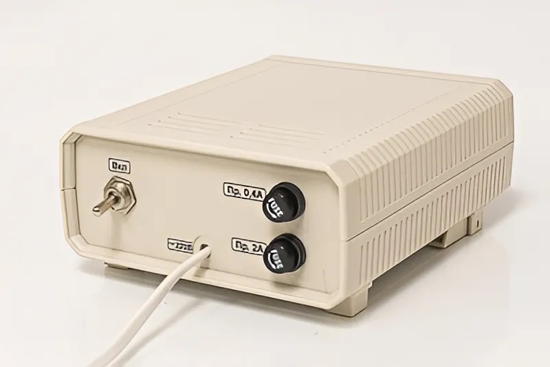 Электрическая схема прибора смонтирована в пластмассовом корпусе. На передней стенке расположены клеммы для подключения нагрузки, ручка регулятора для установки напряжения, вольтметр класса точности 2,5 и переключатель режимов. На задней стенке размещены предохранители на 0,4А и 2А и выключатель сети.