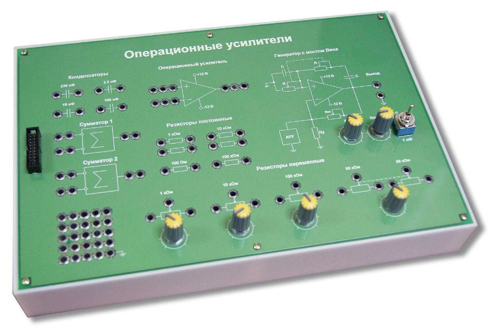 Сменная панель содержит все необходимые электронные компоненты для исследования устройств на основе операционных усилителей, а также два линейных сумматора и блок генератора гармонических колебаний с мостом Вина, расширяющих функциональные возможности панели.