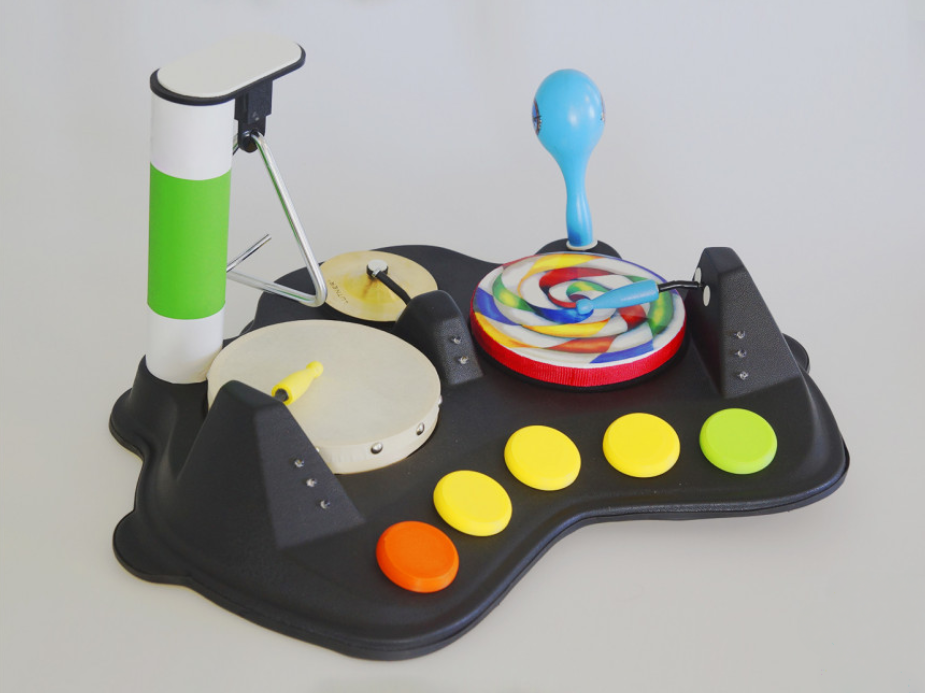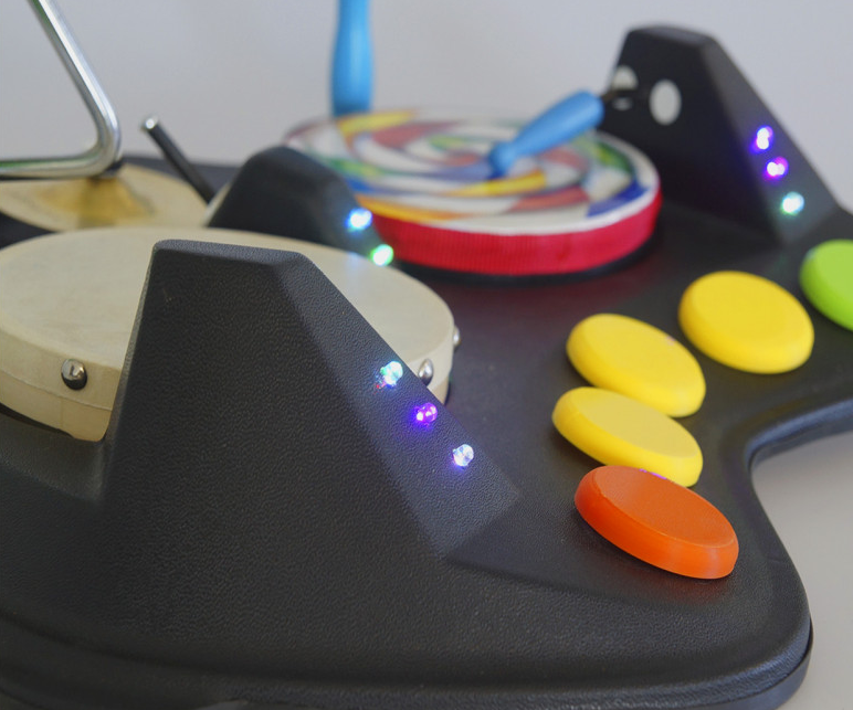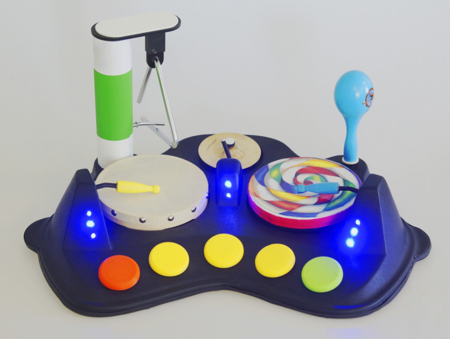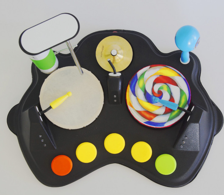 Барабанная установка. Это устройство для проведения музыкальной терапии. Состоит из 5 ударных музыкальных инструментов. Для того, чтобы начать играть на бубне, треугольнике, барабане, кимвале, маракасах, задействуется кнопка с изображением инструментов. При этом установка подсвечивается изнутри многоцветными светодиодами. Возможность одновременно играть на всех инструментах. Питание, батарейки, в комплекте.