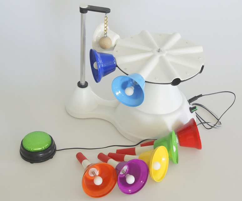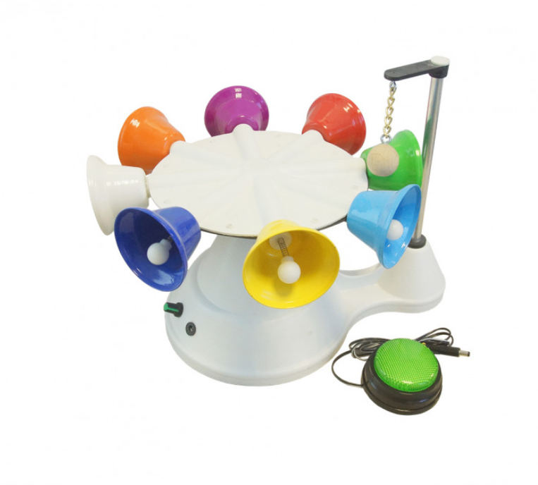 Музыкальная карусель – это механическое устройство, на корпусе которого расположены приборы управления (кнопка активации, регулятор скорости вращения, разъем для подключения дистанционной кнопки). На верхней части карусели, расположен вращающийся элемент на котором расположены съемные колокольчики в количестве 8 шт. Сбоку есть вертикальный шток, на выносном кронштейне которого закреплен шар, при вращении площадки с колокольчиками он ударяется о корпус колокола, который в свою очередь издает звонкую мелодию. Все колокольчики имеют разный окрас, а также разную мелодию звучания. В комплект входит дистанционная кнопка.