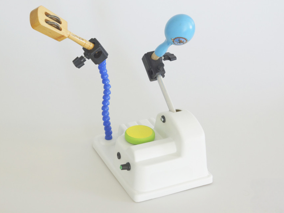Музыкальная машина – это музыкальное механическое устройство, которое имеет электропривод приводящий шток с музыкальным инструментом в поступательные движения, а также пластиковый шток, который можно изгибать просто ручной силой, на него также закреплен кронштейн для вставки музыкальных инструментов.