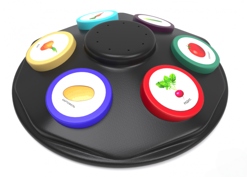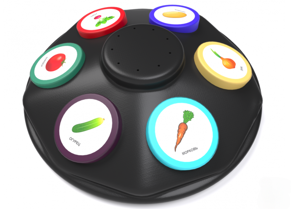 Вращающийся многоуровневый игровой коммуникатор – это устройство с весьма «говорящим» названием. Основание корпуса может вращаться для более удобного доступа ко всем кнопкам коммуникатора. Был разработан с целью улучшения качества коммуникации детей, имеющих проблемы со слуховым, визуальным, тактильным восприятием и социализацией. На корпусе расположены 6 кнопок для записи и воспроизведения голосовых сообщений. Устройство изготовлено из высококачественного ударопрочного пластика, имеет обтекаемые плавные формы без острых краёв и углов.