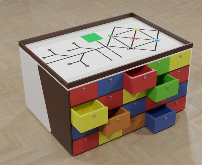 Этот стол для практических занятий по робототехнике - настоящий полигон для испытаний роботов! Изготовлен в контрастных цветах. Имеет просторную столешницу, которая оборудована специально для моделей с алгоритмом "движение по черной линии". Бортики столешницы не позволят роботам падать на пол во время передвижения и обеспечат их сохранность. Устойчивая конструкция гарантирует безопасность во время занятий. Множество вместительных ящиков помогут детям всегда хранить под рукой то, что необходимо для занятий - это могут быть отдельные детали или целые комплекты базовых и ресурсных комплектов конструктора, методические пособия и собственные наброски на бумажных носителях. Стол изготовлен исключительно из качественных и прочных материалов, что позволит ему прослужить детям в течении долгого времени.