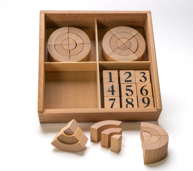 Первые шесть комплектов представляют базовые «дары» немецкого педагога, их использование помогает ребенку усвоить и почувствовать самые важные цвета и формы окружающего мира, а также познакомиться с основными абстрактными понятиями.