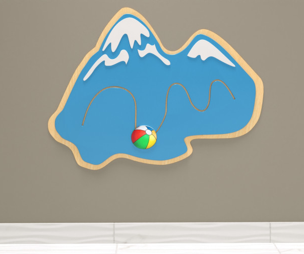 Бизиборд в виде мячика крепится к стене. Основание исполнено в виде снежных гор, окрашенных в бело-голубой гамме. Поверхность бизиборда обработана по специальной технологии, гарантирующей безопасное использование. Прекрасно подойдёт для оснащения детских уголков в различных заведениях (кафе, магазинах, банках), размещения в группах детских садиков и яслей, подойдёт и для использования дома.