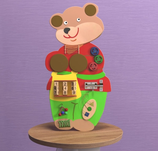 Бизиборд в виде мишки потапыча - один из тех детских игровых модулей, который крепится к стене. Это дидактическое приспособление с игровым уклоном и с высокой игровой ценностью для детей от 1 года. Основа изготовлена в виде фигуры медведя из русской народной сказки, на которой размещены разнообразные приспособления для детской игры. Все края закруглены и обработаны по специальной технологии, что гарантирует безопасность в использовании даже самыми маленькими детками.