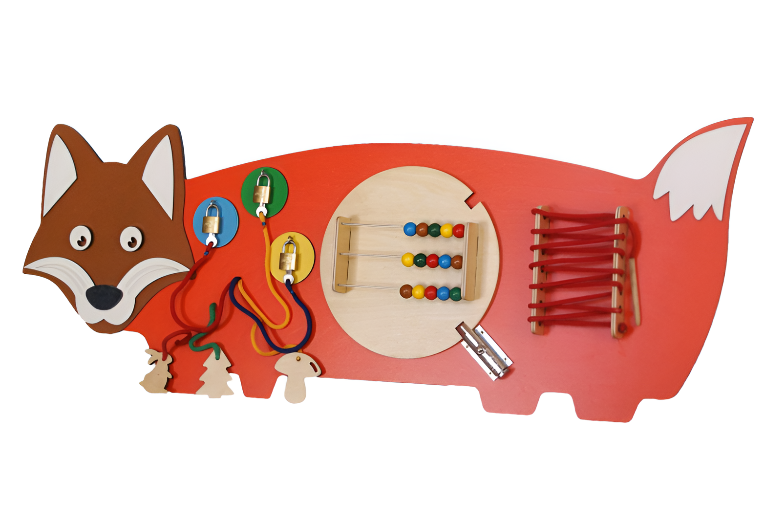 Бизиборд в виде лисы – развивающая игра, которая улучшает моторику и формирует двигательные навыки. Точные и ловкие движение пальчиков малыша в дальнейшем отражаются на развитие речи и ребенка в целом. Шнуровка - отличная тренировка ловких движений и воображения.