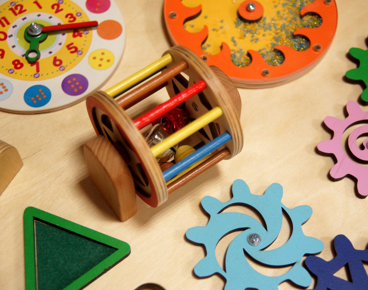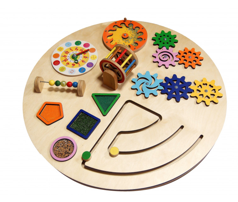 На бизистоле представлены разнообразные игровые элементы, такие как шестеренки, объемное колесо с элементами, часы, цифры, тактильные области, руль, счеты, круг с прозрачной передней стенкой и сыпучим содержимым, тактильный лабиринт. Эти элементы развивают моторику рук, координацию движений, логику и воображение. Малыши смогут собирать, крутить и отслеживать перемещение различных частей, что способствует развитию их наблюдательности и познавательных способностей.