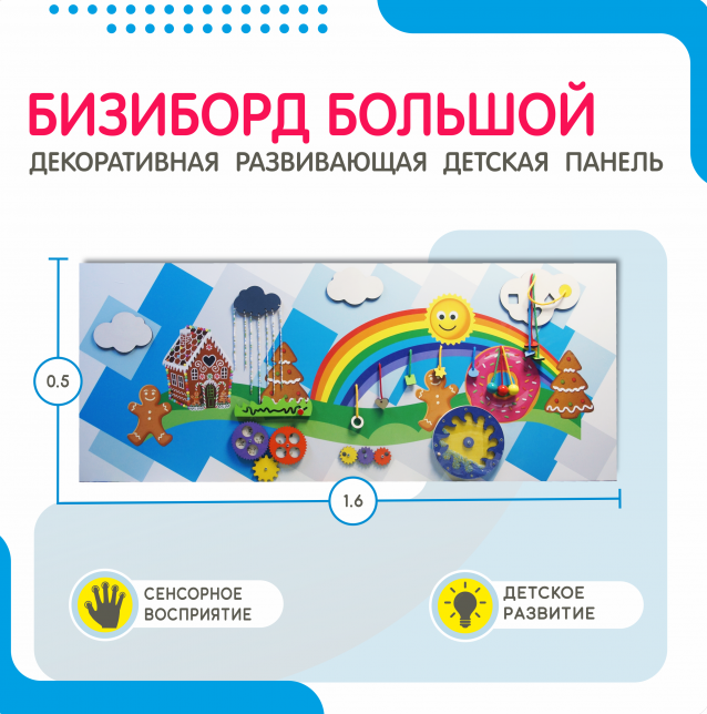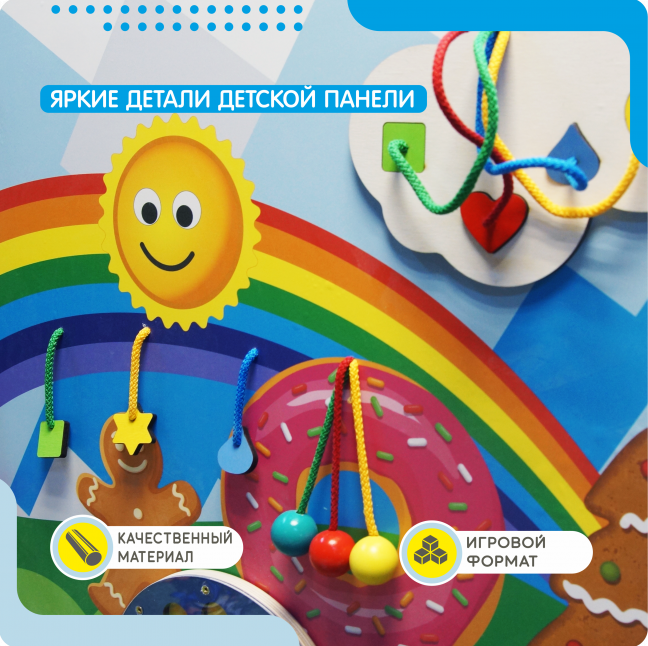 Настенная панель на тему веселых приключений - сказочная настенная игровая панель для весёлого времяпрепровождения малышей. Основание представленной модели имеет сложную многоугольную форму, выполнено в бело-голубой гамме, а игровые элементы выделяются на нём яркими акцентами.