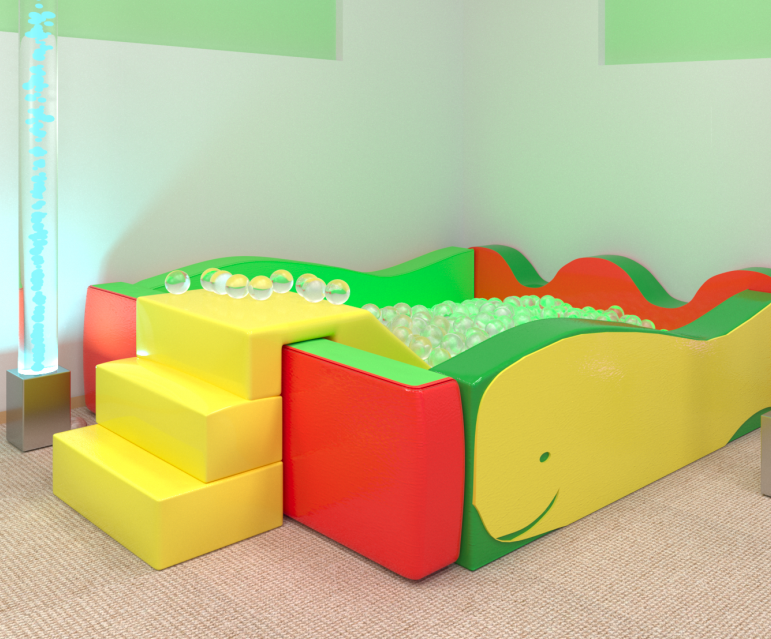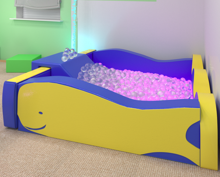 Бассейн сухой мягкий бескаркасный в виде кита с горкой не только станет замечательным дополнением к игровому пространству детской спортивной комнаты в детском садике или дошкольном центре раннего развития, но ещё может стать функциональной частью комнат релаксации для занятий с детьми, имеющими особенности развития. Благодаря практичной прямоугольной форме и просторной игровой площади бассейн будет идеальным пространством для игр и тематических занятий по сенсорной интеграции. В результате получится комплексный модуль для тёмной сенсорной комнаты.