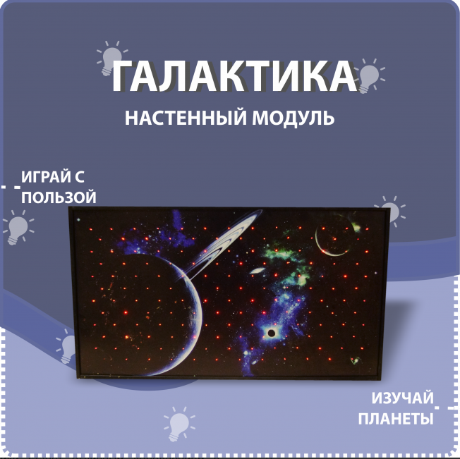 Настенный модуль на тему галактики станет отличным дополнением в сенсорную комнату. С помощью этого изделия у детей развивается зрительная память, снимается стресс и поднимается настроение. Модуль выполнен из фанеры, на которую нанесен принт галактики, с обратной стороны панели вставлены специальные волокна премиального качества, которые имитируют звезды. Одним из главных достоинств является мощный источник света, при котором волокна хорошо светятся даже днём, так что не обязательно затемнять комнату шторами. Изделие выполнено из натуральных материалов, и отвечает всем требованиям безопасности. В комплекте идет беспроводной пульт управления, переключающий режимы работы. Изделие поставляется в собранном виде в упаковке, предотвращающей повреждения при транспортировке.