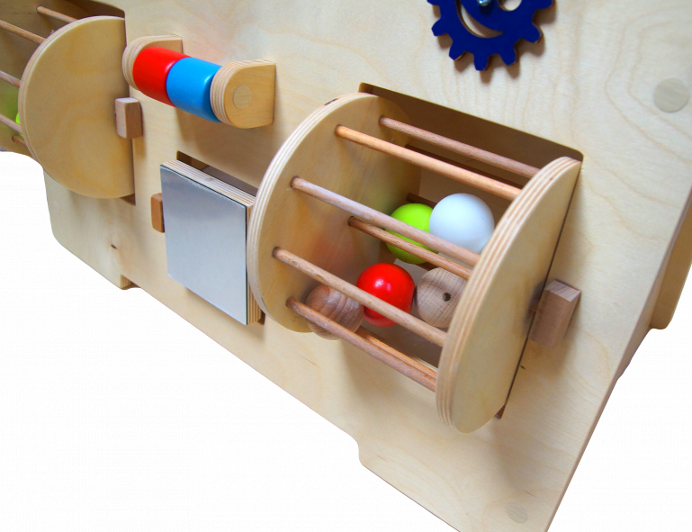 Панель научит ребенка четко двигать и управлять руками, хватать и крутить предметы. Это развивает мелкую моторику и влияет благоприятно на центры речи. Деревянные шестеренки очень удобны для маленьких пальчиков детей, благодаря им малыш лёгким прикосновением приводит весь ряд в движение. Ребенок сможет научиться крутить колесо и почувствует работу механизма. Это территория вашего ребёнка, на которой он может спокойно крутить и трогать предметы.