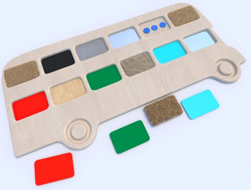 Тактильные разноцветные дощечки в виде автобуса - это красивая игровая зона, которая выполнена из качественных материалов и не оставляет зацепок в детских ручках. Это развивающий набор, который похож на автобус, но вместо окон в нем цветные дощечки, их 12 штук. Каждая отличается от другой не только оттенком, но и текстурой: есть с пуговицами, есть с веревкой, пухом. Тактильные разноцветные дощечки в виде автобуса заинтересуют как маленьких детей, так и постарше, а родителям помогут сохранить дом в целости и сохранности. Подойдут для домашнего использования и для специальных учреждений.