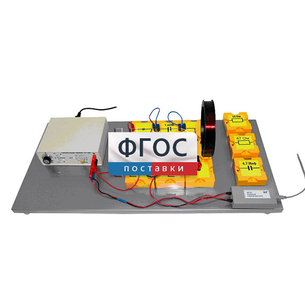 Последовательный колебательный контур собран на металлической платформе с магнитным закреплением элементов и использованием жестких соединителей для объединения элементов в электрическую цепь. Обозначения элементов нанесены на их лицевой (верхней) поверхности.