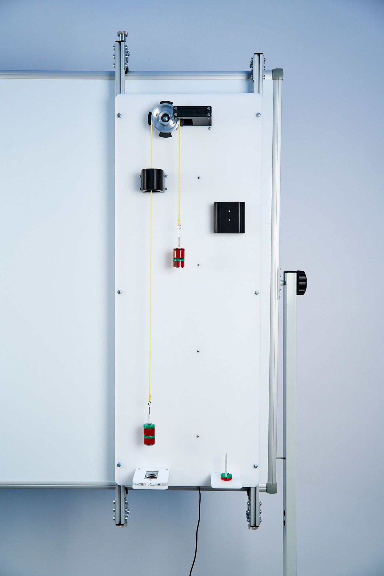Лабораторная установка представляет собой машину Атвуда, на которой два одинаковых груза связаны нитью, перекинутой через легкий блок. При помещении на один из грузов дополнительного грузика грузы начинают двигаться с ускорением. Для регистрации движения грузов использован оптоэлектрический датчик, перекрытие которого осуществляется установленной на блоке крыльчаткой.