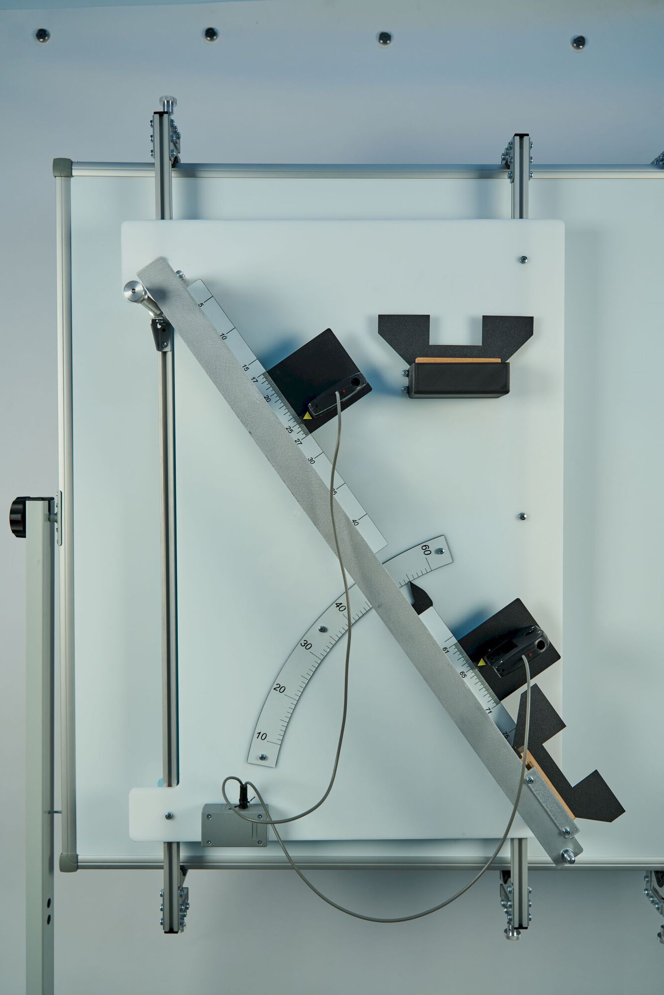 Основным элементом лабораторной установки является скамья, магнитное крепление которой позволяет устанавливать её под любым углом к горизонту. Скамья имеет шкалу для определения положения датчиков и транспортир с отвесом для измерения угла наклона. Движение брусков, которые отличаются друг от друга только материалом скользящей поверхности, контролируется оптоэлектрическими датчиками.