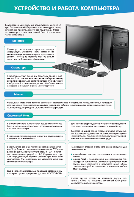 Стенды предназначены для наглядного отображения информации об устройстве персонального компьютера и поэтапной схеме его работы при включении.