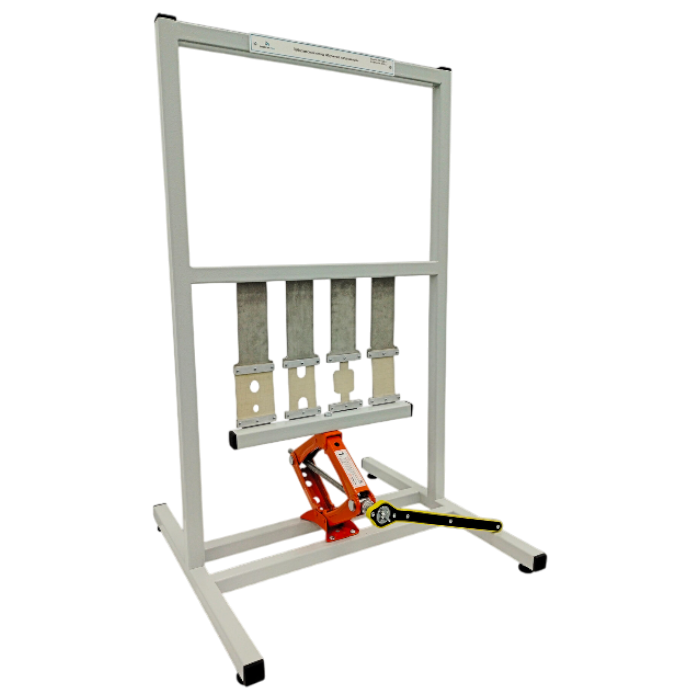 Стенд "Изучение напряжений" представляет собой сварную раму, основание, зажимные пластины, устройство для создания нагрузки, маховик, образцы.
