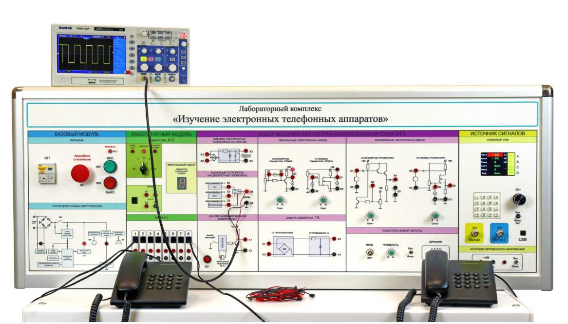 Лабораторный комплекс формирует одно рабочее место для двух студентов и обеспечивает проведение серии экспериментов по теме «Электронные телефонные аппараты» учебного лабораторного практикума специальностей электросвязи.