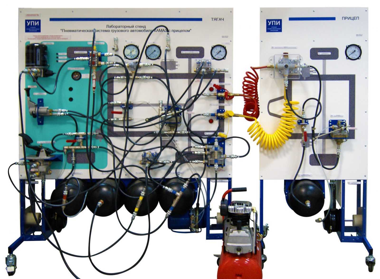 Лабораторный стенд «Пневматическая система грузового автомобиля КАМАЗ с прицепом» предназначен для изучения устройства пневматической системы грузового автомобиля, отдельных элементов пневматической системы на примере автомобиля КАМАЗ, позволяет приобрести практические навыки по сборке пневматических схем с использованием пневматических шлангов с быстроразъемными соединениями (БРС).