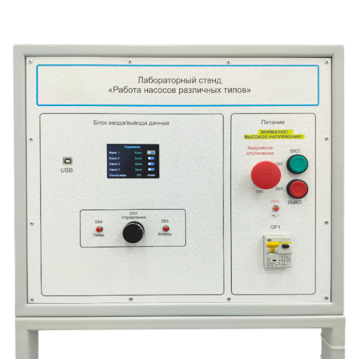 Для проведения лабораторных работ стенд укомплектован измерительной и управляющей системами. Все датчики, установленные на объектах исследования, подключены к измерительной системе. Управляющая система, обеспечивает включение и выключение насосов.