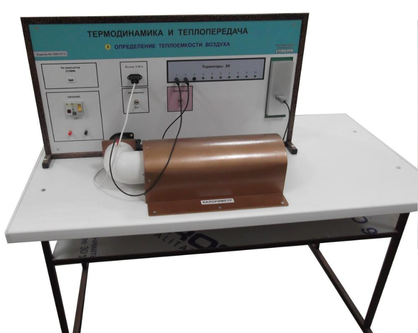 Реальный процесс моделируется с помощью проточного калориметра с выводом задаваемых параметров (напряжения и силы тока в цепи нагревателя, расхода воздуха через калориметр) и измеряемых (температура воздуха на входе и выходе из калориметра) на монитор.