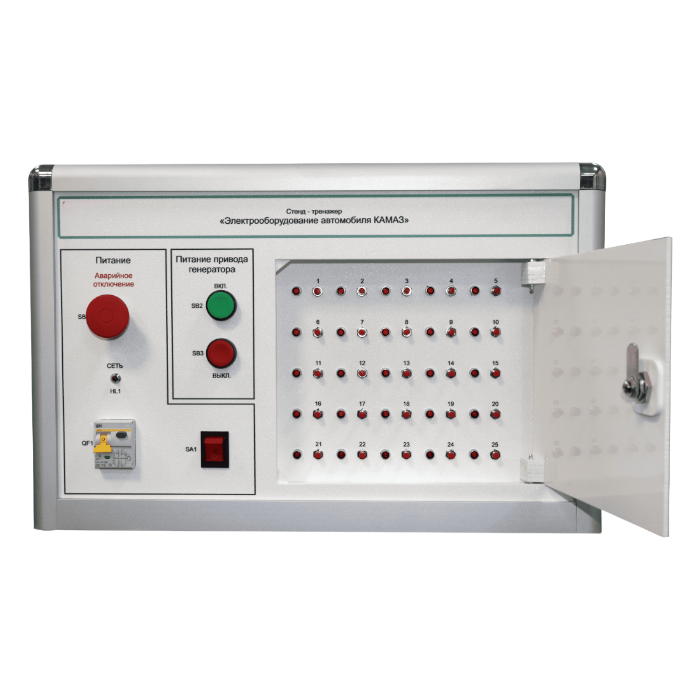 Стенд-тренажер предназначен для изучения электрооборудования автомобиля КамАЗ, отработки навыков поиска и устранения типовых неисправностей, которые возникают в процессе эксплуатации автомобиля, техническому обслуживанию и ремонту автомобиля, получению навыков по диагностике неисправностей электрооборудования.
