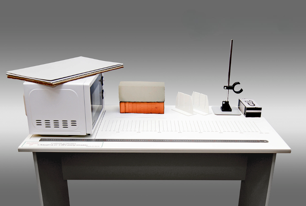 Учебная установка состоит из лабораторного стола с нанесенной координатной разметкой, устройством крепления экранов, бытовой СВЧ печи с устройством имитации утечки излучения, комплектом экранов, комплектом балластных поглотителей СВЧ поля, а также устройства измерения плотности потока мощности утечки СВЧ излучения с цифровой индикацией показаний (датчик СВЧ излучения).