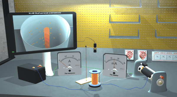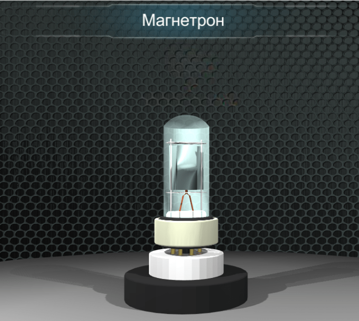 Практикум позволяет в трехмерной среде изучать траекторию движения электрона в вакуумной лампе при различных значениях тока катушки магнетрона. Все составляющие каждой модели имеют подписи с названием.